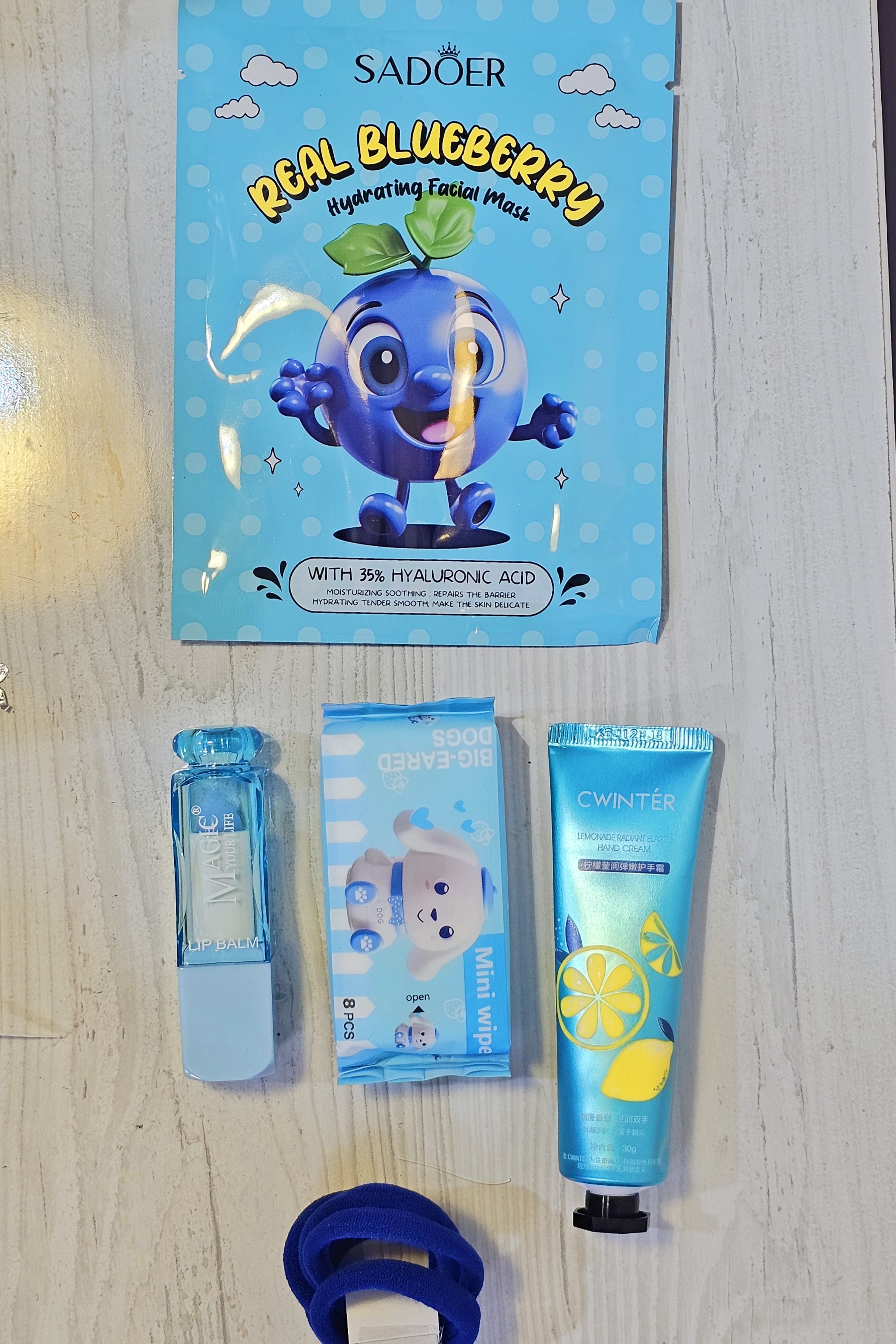 پک کادویی ولنتاین روز مادر تولد روز دختر رنگ آبی 🩵 کرم دست میوه ای ماسک ورقهای دستمال مرطوب مینی بالم لب حرارتی کش سر ۵ عددی