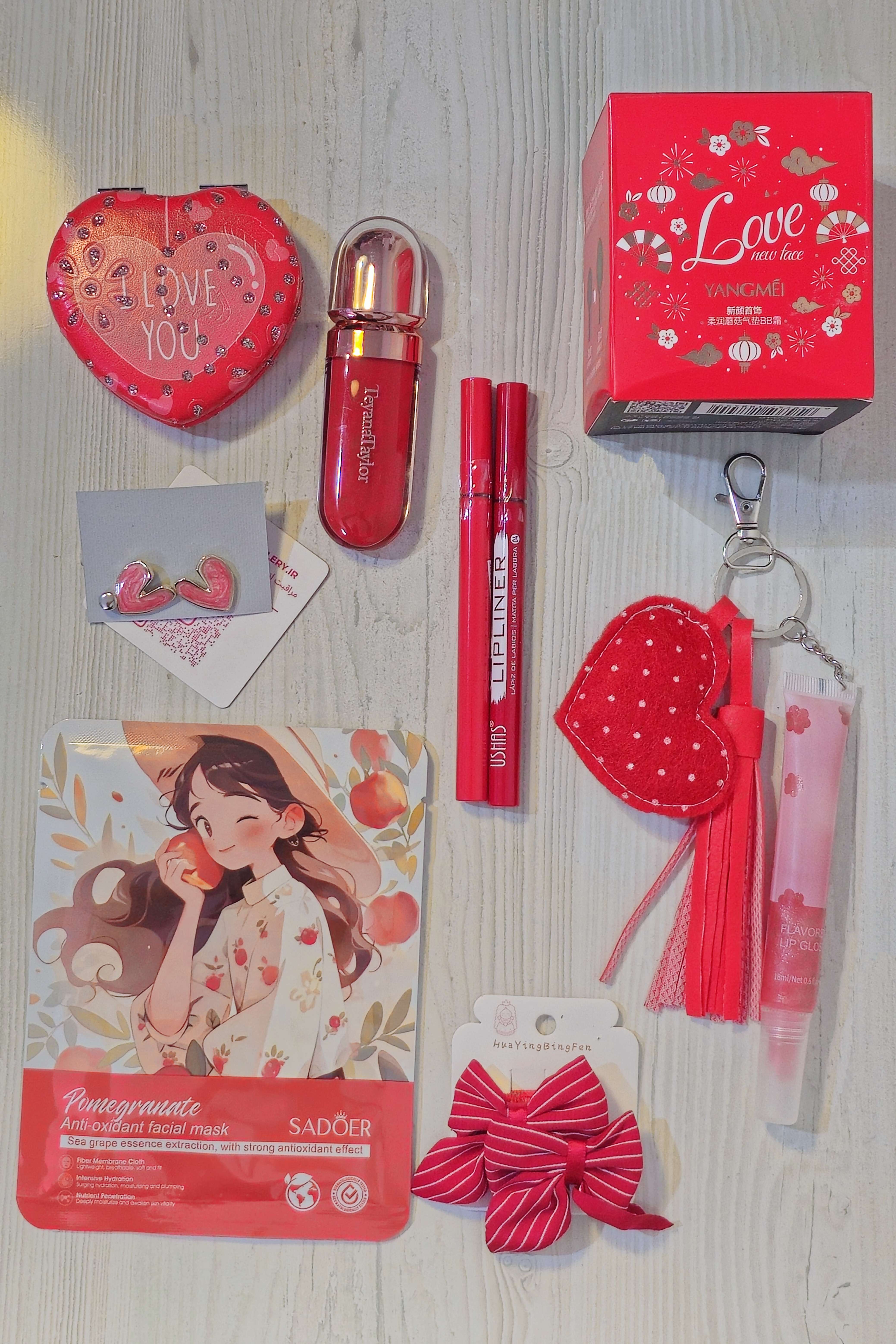 پک هدیه ولنتاین کادویی قرمز ♥️ ماسک ورقه ای شیدینگ لب دو رنگ رژ خیس دوپ کیکو گوشواره قلبی میناکاری کوشن لاو چارم بگ لیپ شاین دار کلیپس پاپیونی آینه قلبی