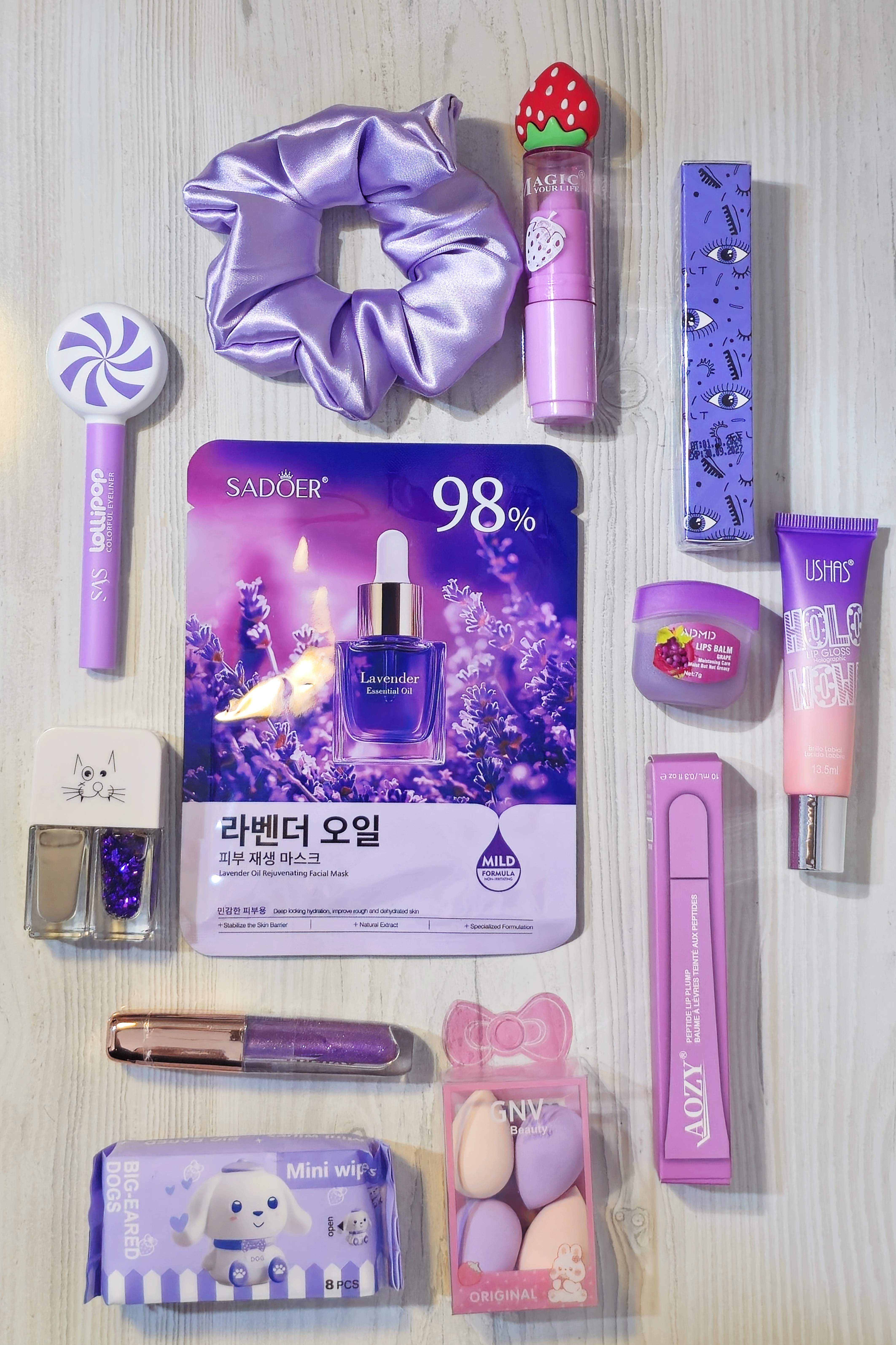 پک هدیه ولنتاین کادویی بنفش 💜 ماسک ورقه ای صورت خط چشم آبنباتی لاک دوقلو سایه شاین مایع پد کانسیلر ۴ تایی لیپ گلاس Aozy بالم لب کاسه ای لیپ شاین کهکشانی تقویت مژه بالم مجیک توت فرنگی کش اسکرانچی دستمال مرطوب مینی